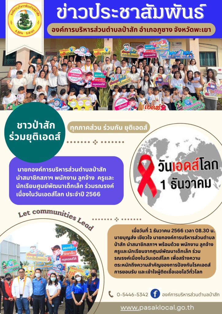 เมื่อวันที่ 1 ธันวาคม 2566 เวลา 08.30 น. นายบุญส่ง เขียวใจ นายกองค์การบริหารส่วนตำบลป่าสัก นำสมาชิกสภาฯ พร้อมด้วย พนักงาน ลูกจ้าง ครูและนักเรียนจากศูนย์พัฒนาเด็กเล็ก ร่วมรณรงค์เนื่องในวันเอดส์โลก เพื่อสร้างความตระหนักถึงความสำคัญของการป้องกันโรคเอดส์ การยอมรับ และเข้าใจผู้ติดเชื้อเอชไอวีทั่วโลก