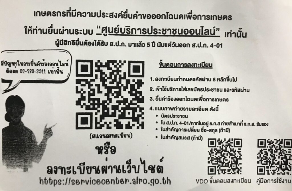 เกษตรกรที่มีความประสงค์ยื่นคำขอออกโฉนดเพื่อการเกษตรให้ยื่นผ่านระบบ ศูนย์บริการประชาชนออนไลน์ โดยสแกนลงทะเบียนผ่าน คิวอาร์โค้ด หรือ ทางเว็บไซต์ https://servicecenter.alro.go.th