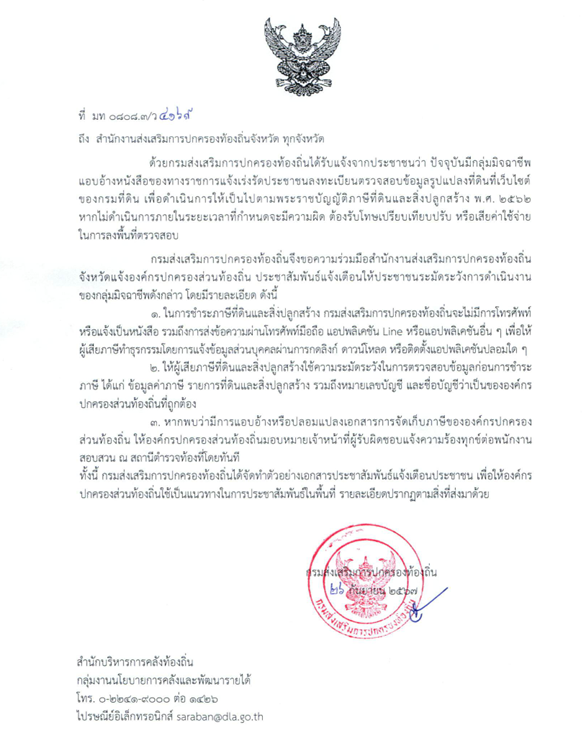 ๑. ในการชำระภาษีที่ดินและสิ่งปลูกสร้าง กรมส่งเสริมการปกครองท้องถิ่นจะไม่มีการโทรศัพท์
